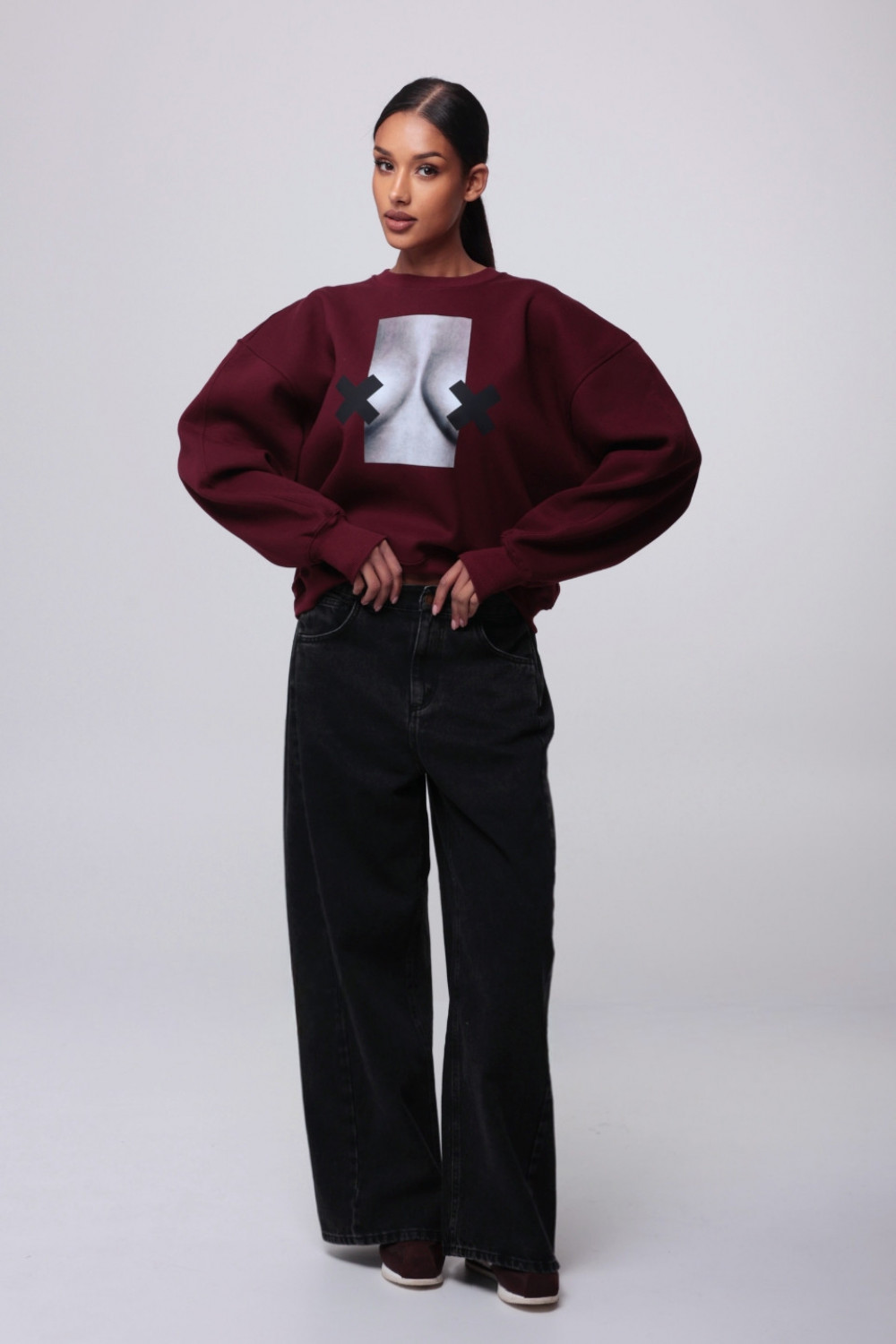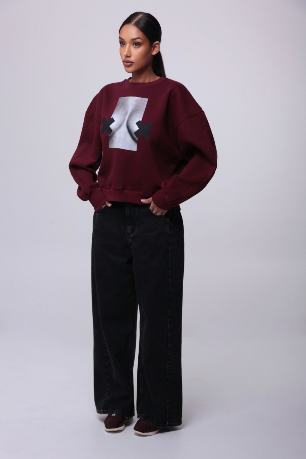 Bluza damska oversize - bordowy NADRUK XX BOOBIES