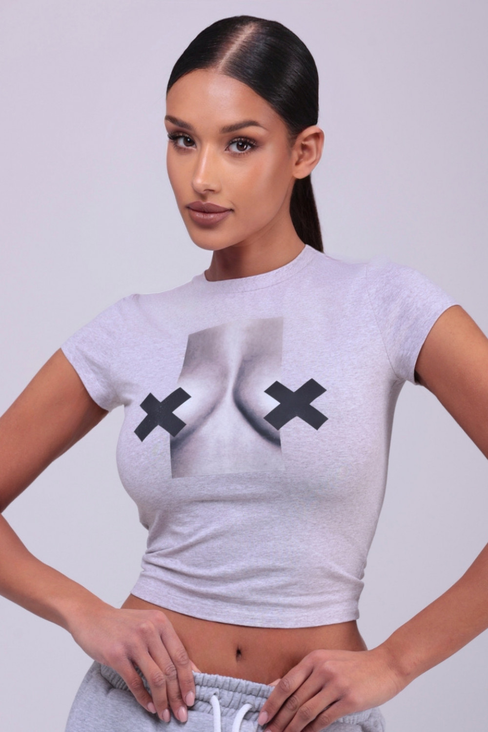Krótki dopasowany t-shirt typu motylek nadruk XX BOOBIES - szary melanż