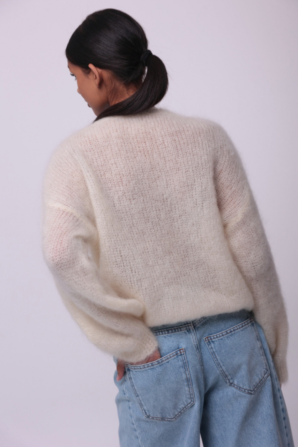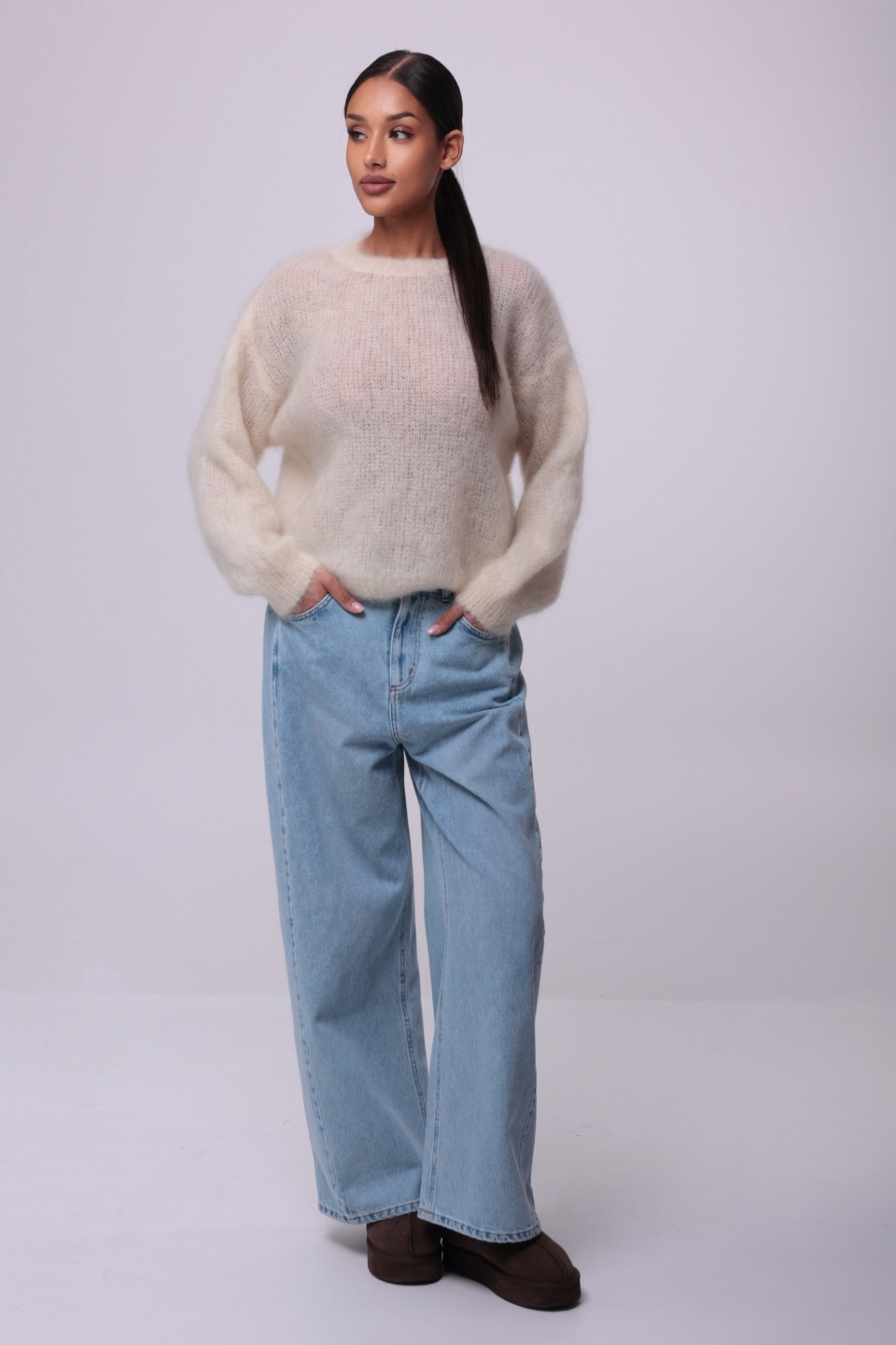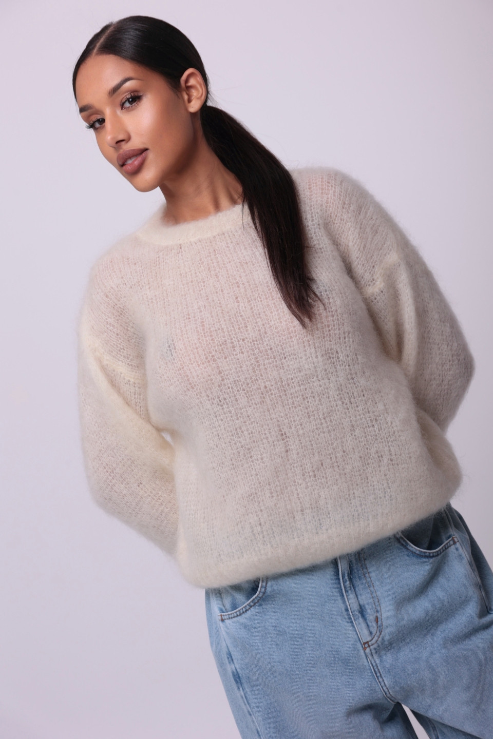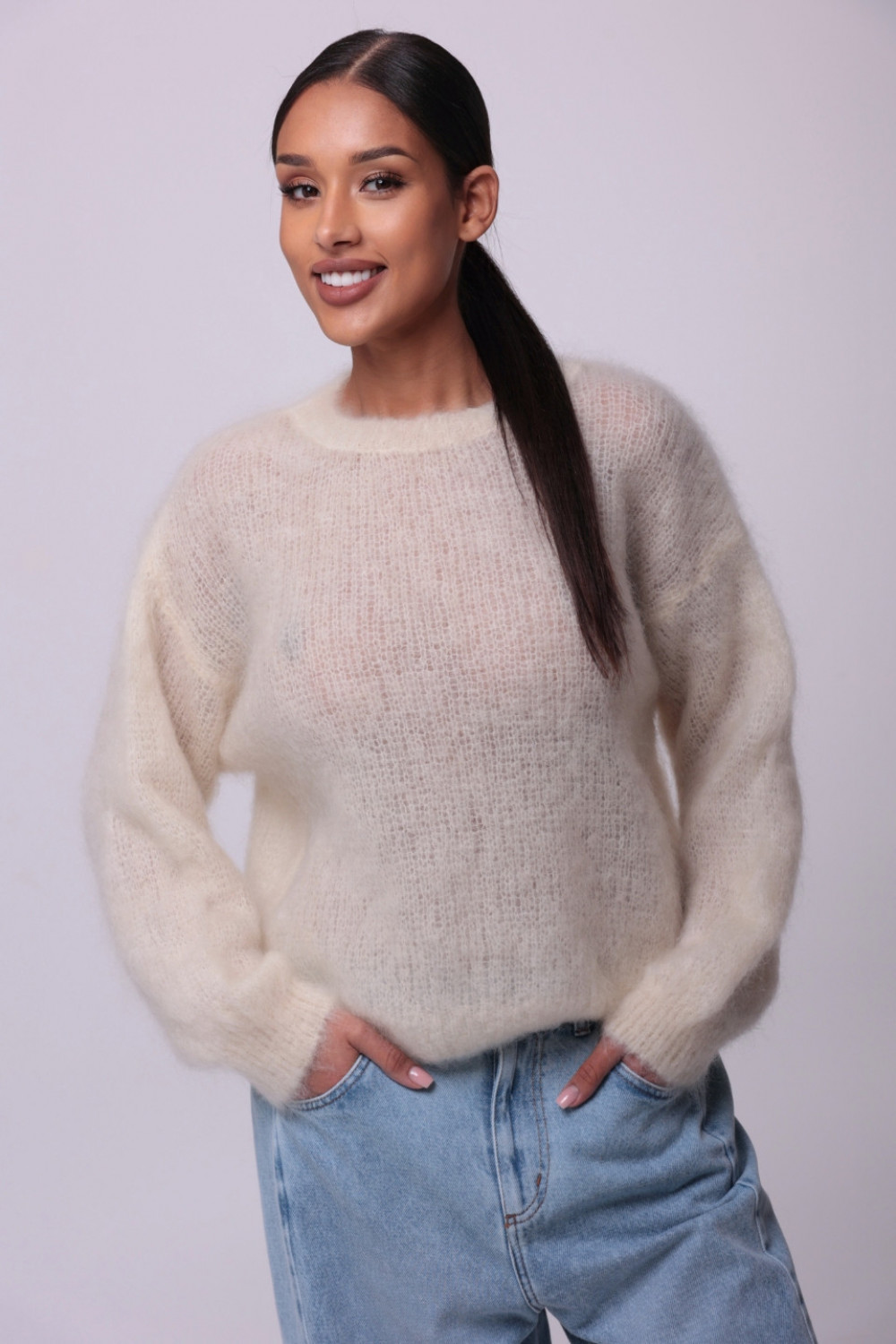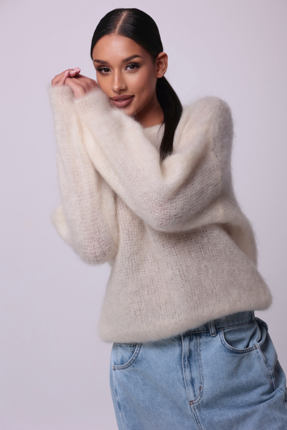 - sweter z puszystej, miękkiej dzianiny z moheru